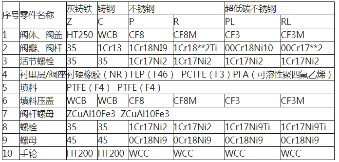 法蘭襯氟截止閥主要零部件材料表: